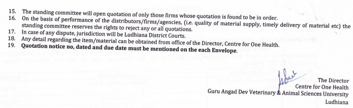 Quotation notice for the purchase of Electrical Items, The Director, Centre for One Health, GADVASU, Ludhiana