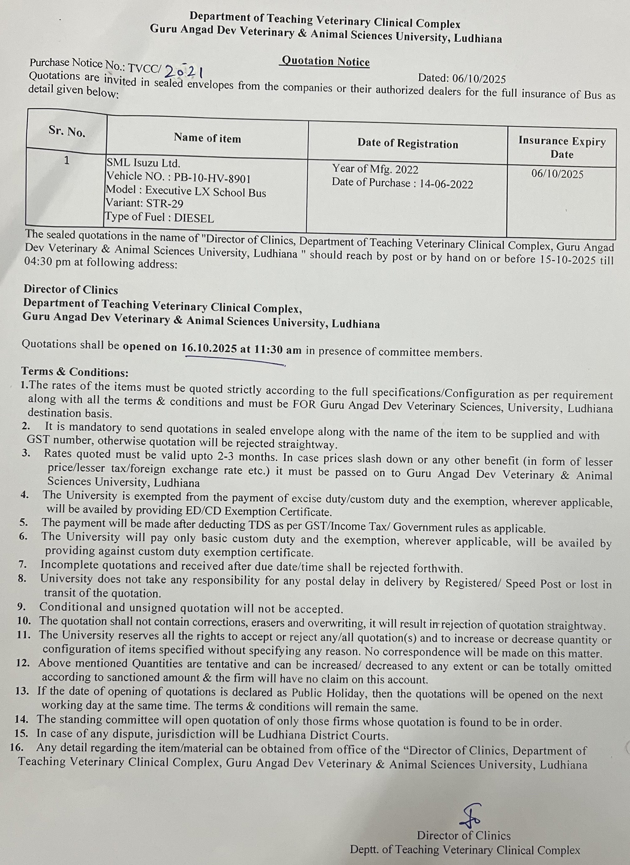 Quotation notice for the purchase of Full Insurance of Bus, Director of Clinics, Department of Teaching Veterinary Clinical Complex, GADVASU, Ludhiana