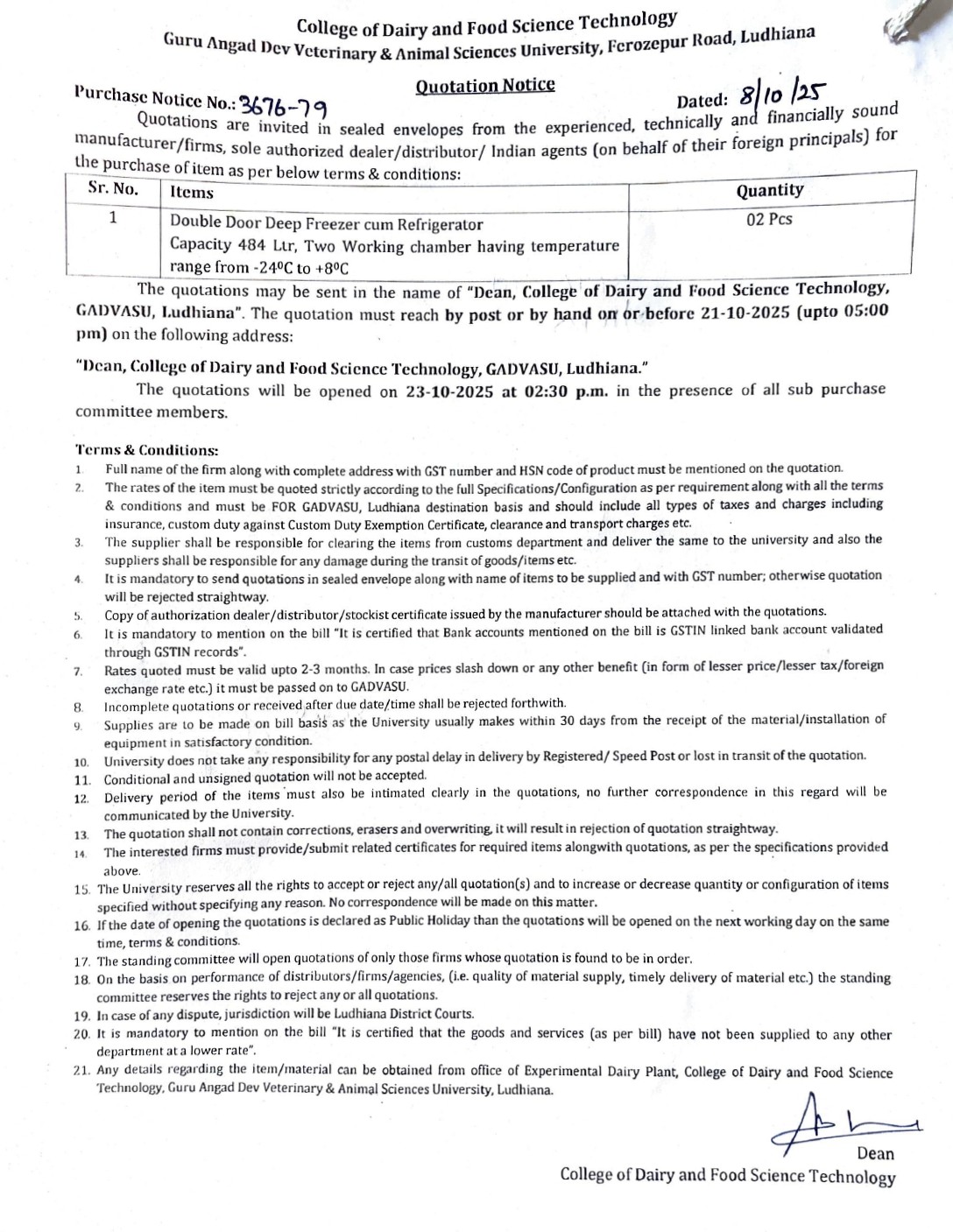 Quotation Notice for the purchase of Double Door Deep Freezer cum Refrigerator, Dean, College of Dairy and Food Science Technology, Guru Angad Dev Veterinary & Animal Sciences University, Ludhiana