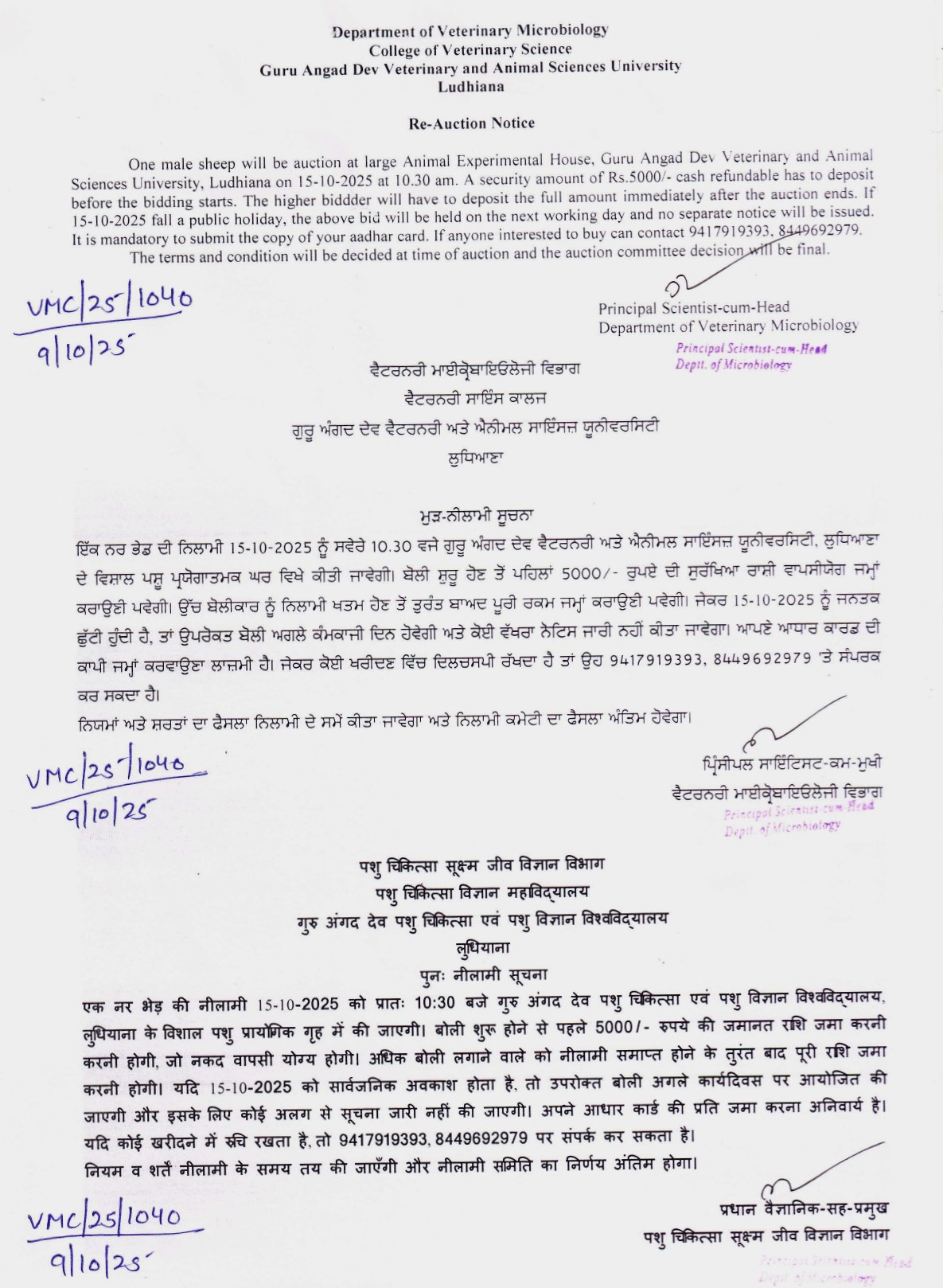 Re-Auction Notice for (One Male Sheep), Department of Veterinary Microbiology, COVS, Guru Angad Dev Veterinary & Animal Sciences University, Ludhiana