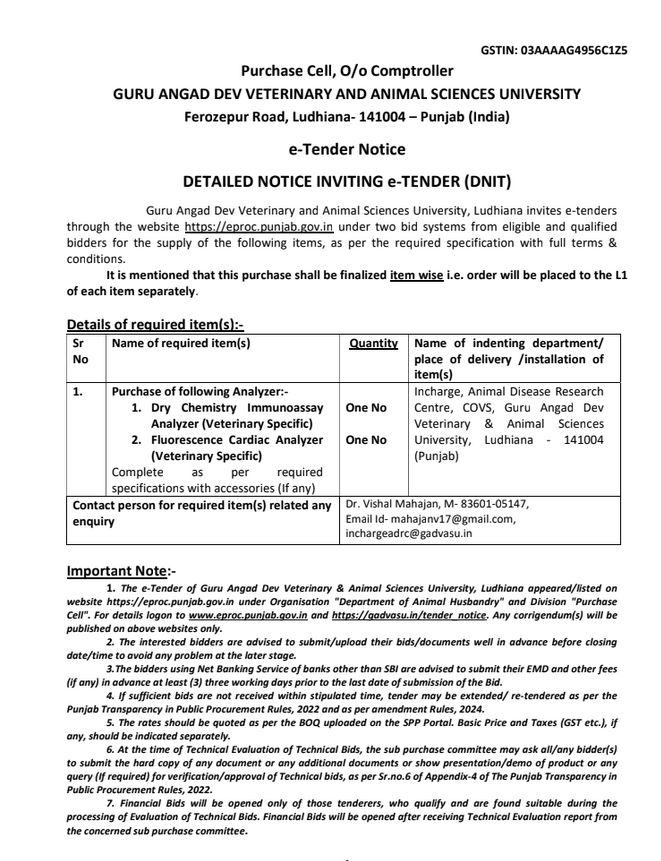 e -Tender notice for the Purchase of Dry Chemistry Immunoassay Analyzer and Fluorescence Cardiac Analyzer, Accounts officer, Purchase Cell O/o Comptroller, GADVASU, Ludhiana
