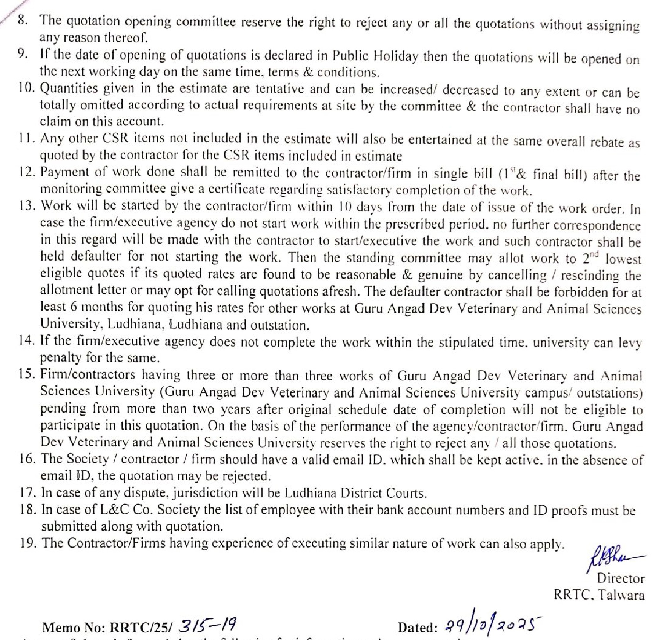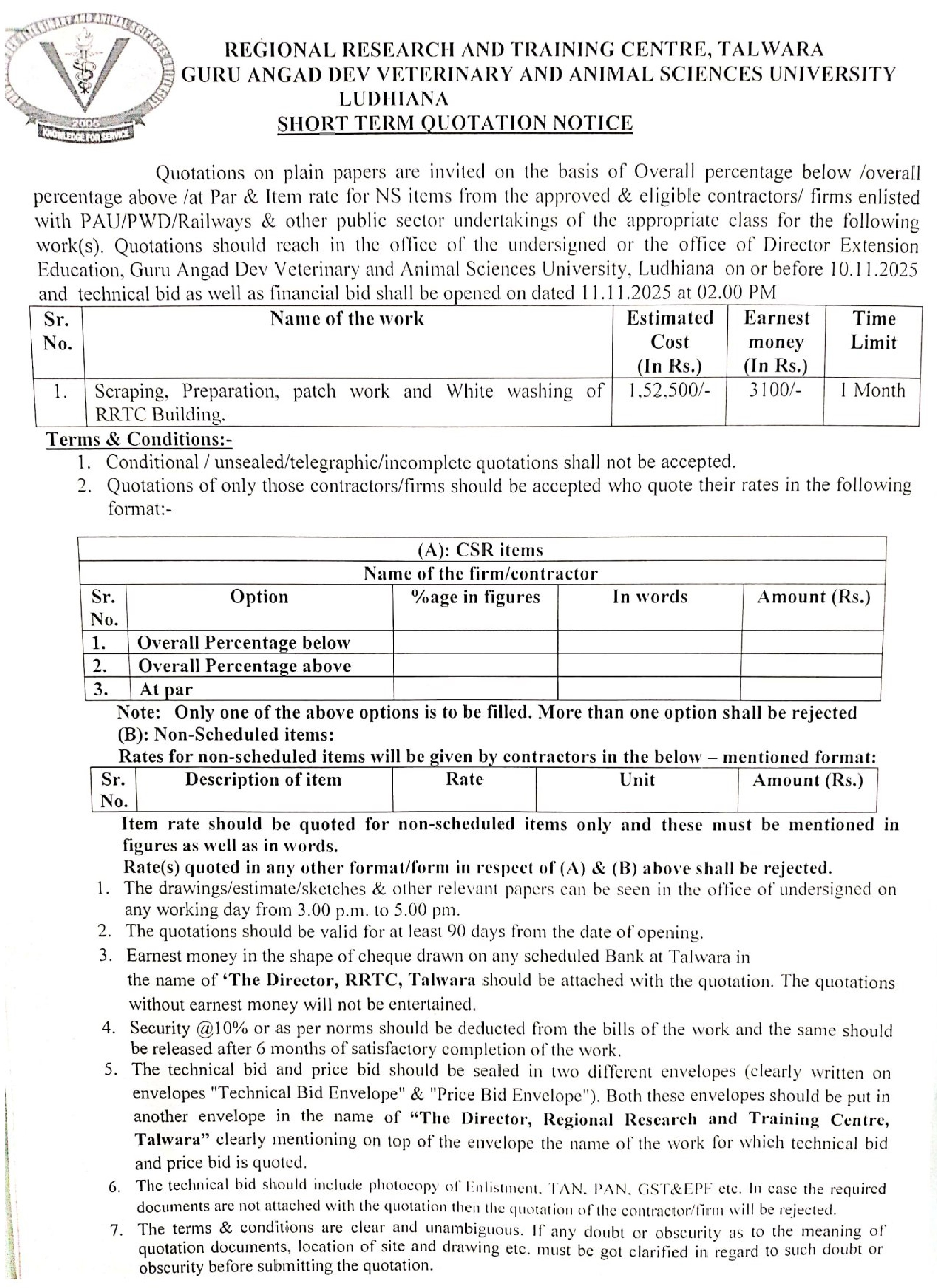 Short term quotation notice for the repair and White Washing of RRTC Building, Director, RRTC, TALWARA , Guru Angad Dev Vety & Animal Sciences University, Ludhiana