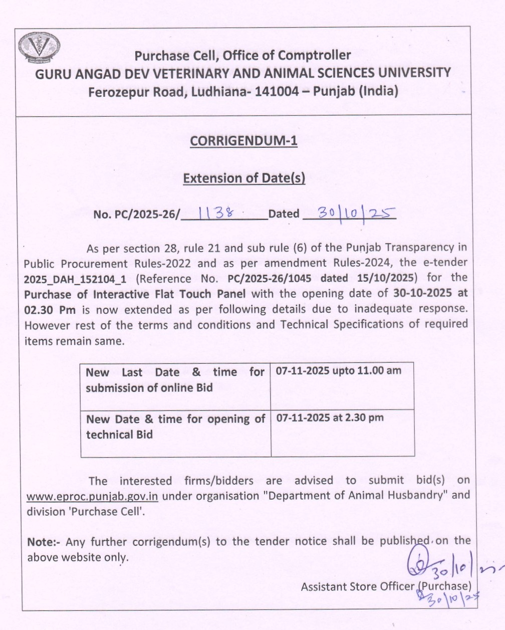 Corrigendum for Extension of dates of e tender for the purchase of Interactive Flat Touch Panel, Assistant Store Officer, Purchase Cell, O/o Comptroller, GADVASU, Ludhiana