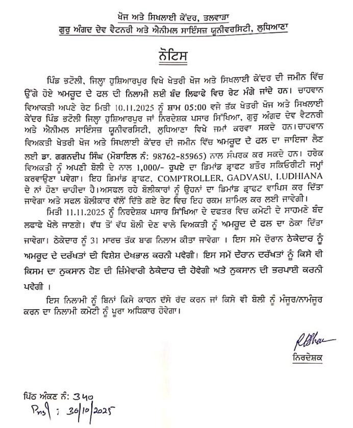 Auction Notice for the Guava fruit grown, Director, RRTC, TALWARA , Guru Angad Dev Veterinary & Animal Sciences University, Ludhiana
