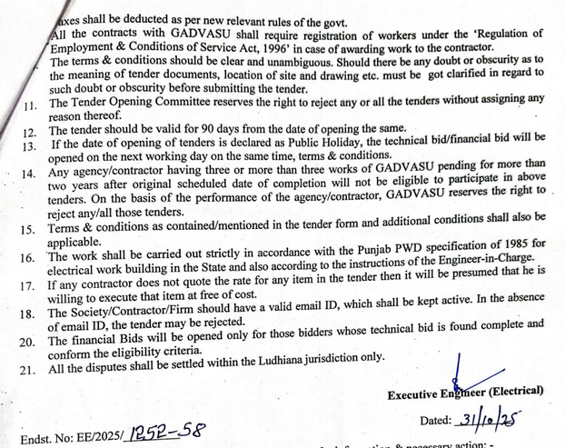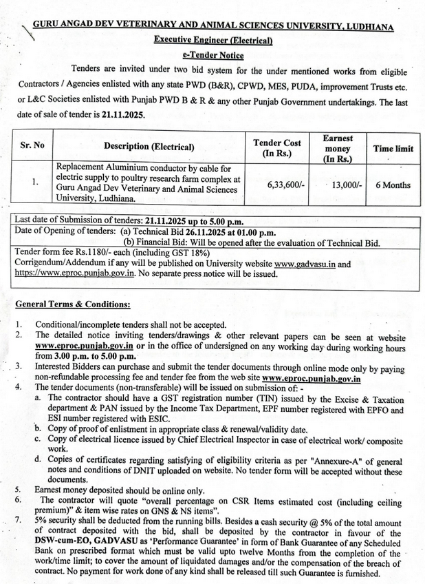 E-Tender Notice no.1252-58 dated 31.10.2025 for Electrical Work, Executive Engineer (Electrical), Guru Angad Dev Veterinary and Animal Sciences University, Ludhiana