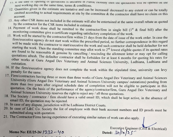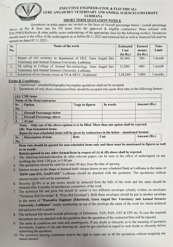 Short Term Quotation Notice for repair of GO Switches, SS Railing Work, Extension of Two Lectures Rooms, Executive Engineer (Civil & Electrical),Guru Angad Dev Veterinary and Animal Sciences Univ. Ldh