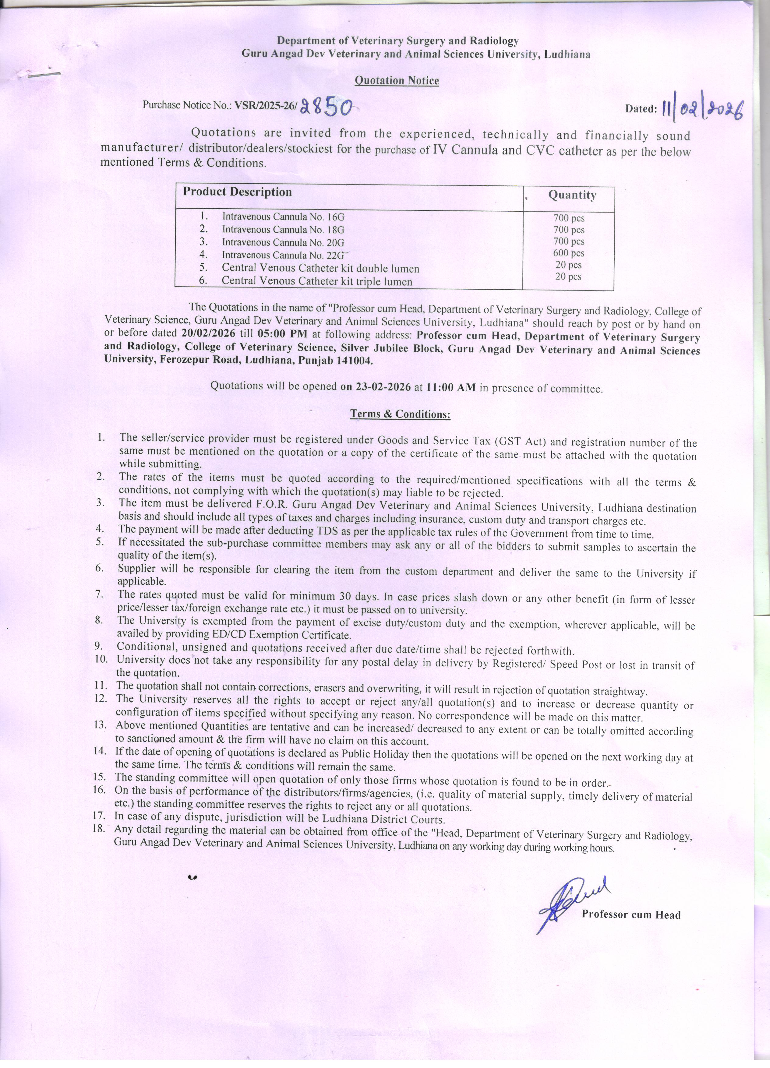 Quotation notice for purchase of IV Cannula and CVC Catheter, Professor cum Head, Department of Veterinary Surgery & Radiology, Guru Angad Dev Vety. & Animal Sciences University, Ludhiana