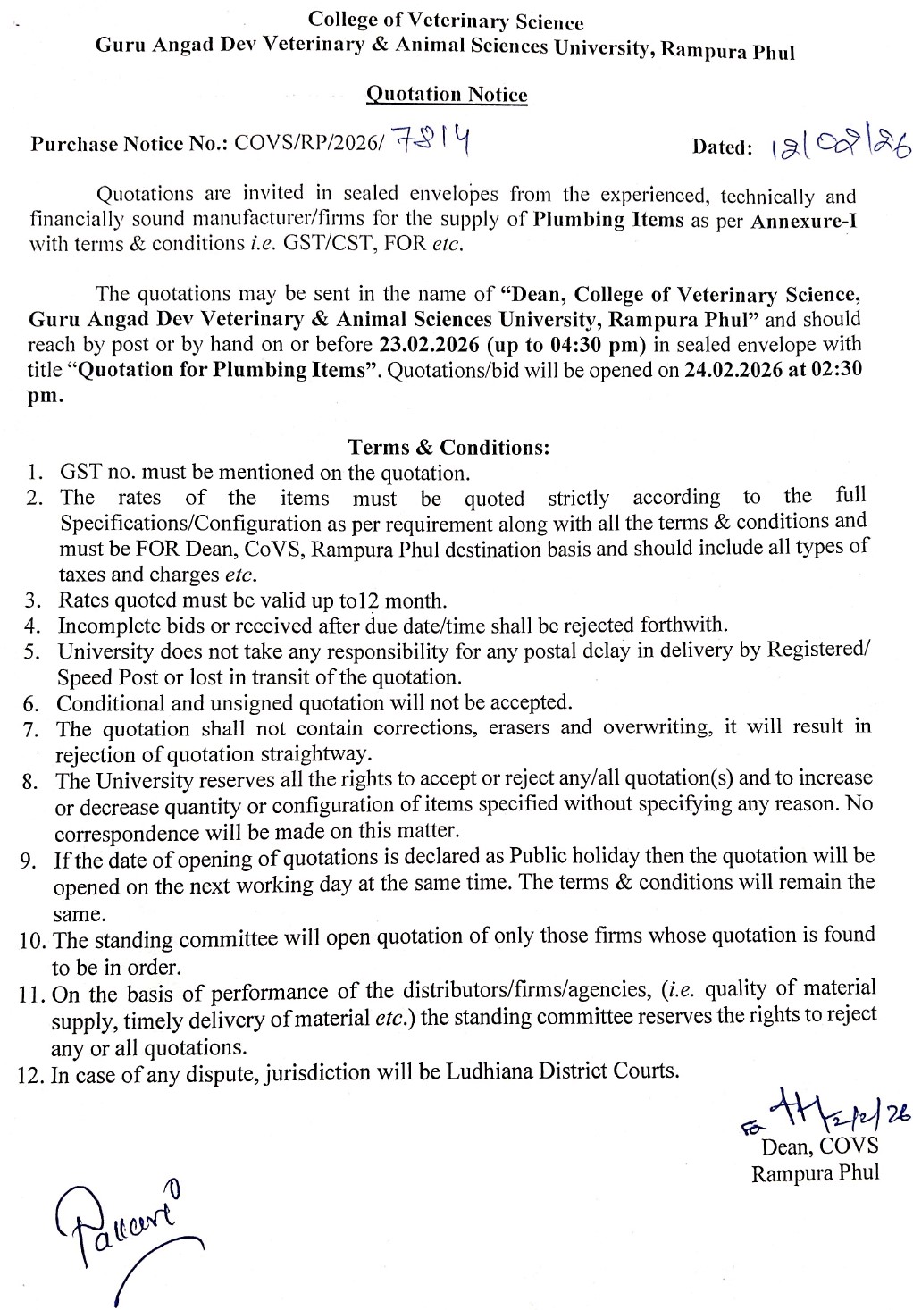 Quotation notice for the supply of Plumbing Items, Dean, College of Veterinary Science, Guru Angad Dev Veterinary & Animal Sciences University, Rampura Phul