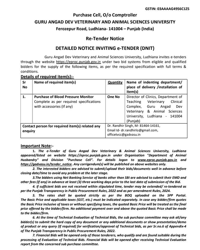 Re -Tender notice for the Purchase of Blood Pressure Monitor, Assistant Store Officer, Purchase Cell O/o Comptroller, GADVASU, Ludhiana