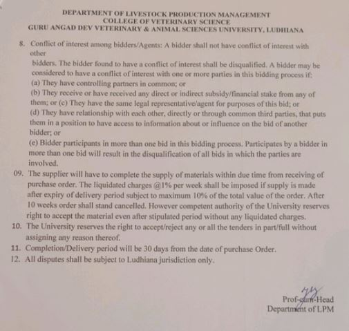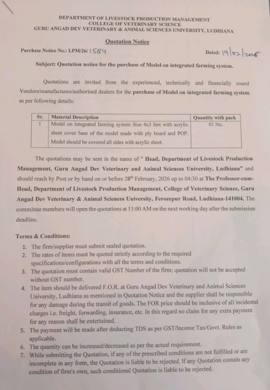Quotation notice for the purchase of Model on Integrated Farming System, Head, Department of Livestock Production Management, COVS, GADVASU, Ludhiana