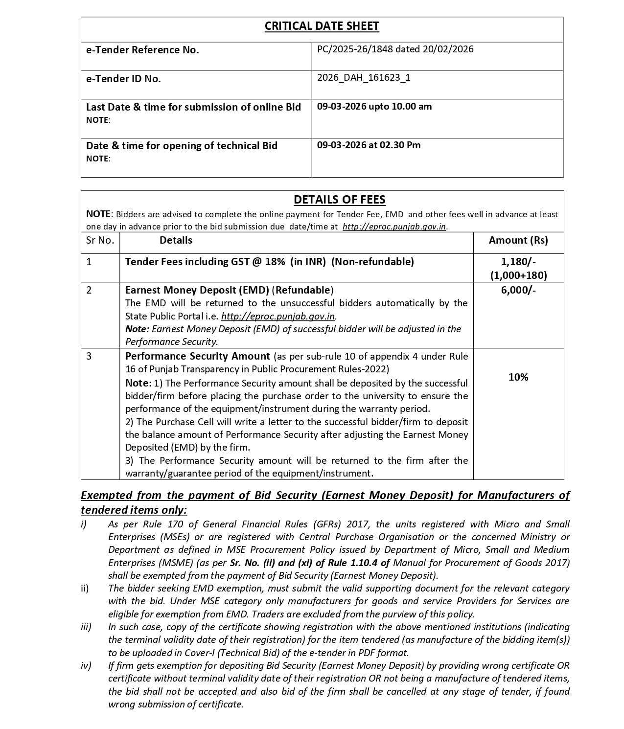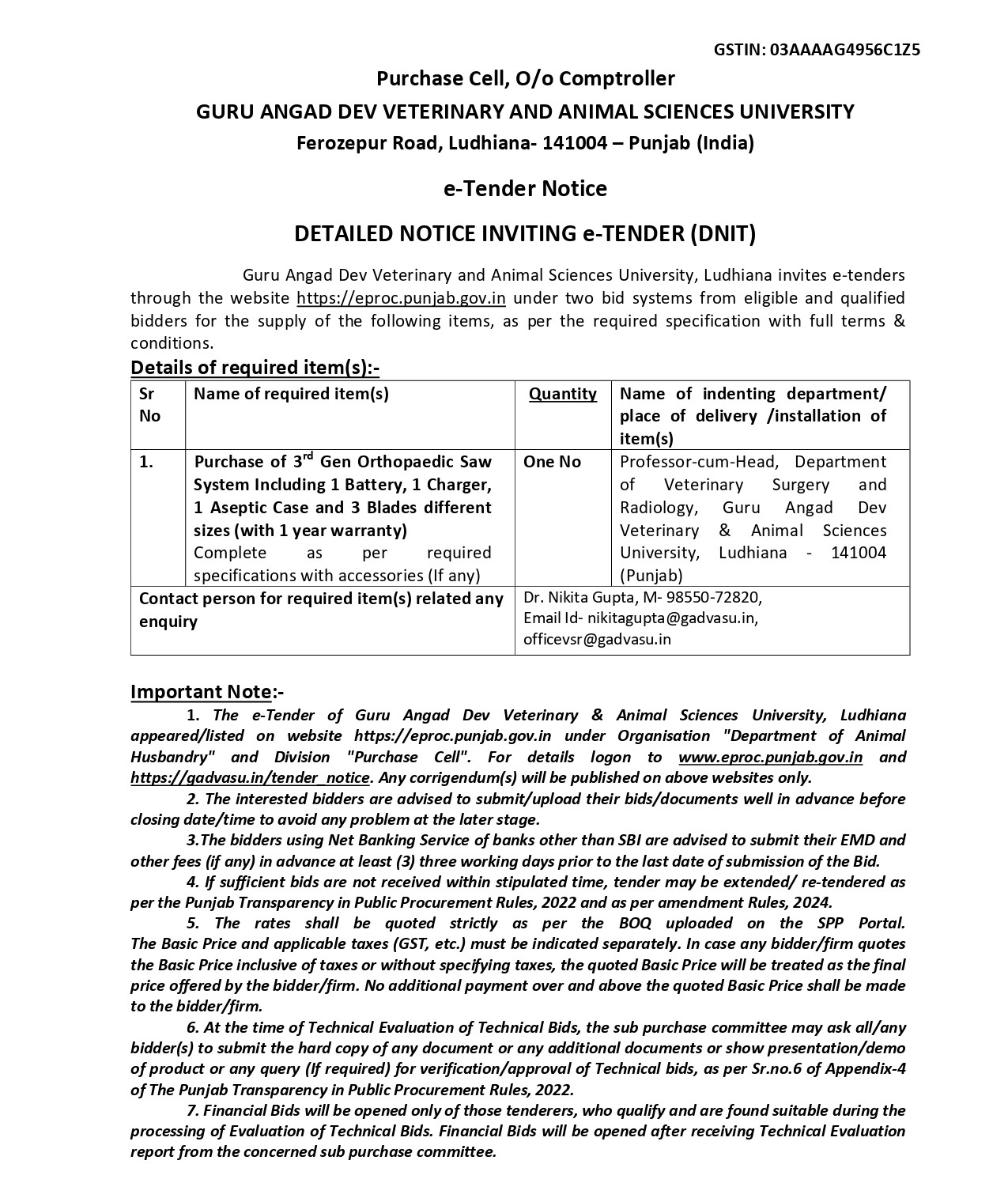 e -Tender Notice for the Purchase of 3rd Gen Orthopaedic Saw System, Assistant Store Officer, Purchase Cell, O/o Comptroller, Guru Angad Dev Veterinary & Animal Sciences University, Ludhiana