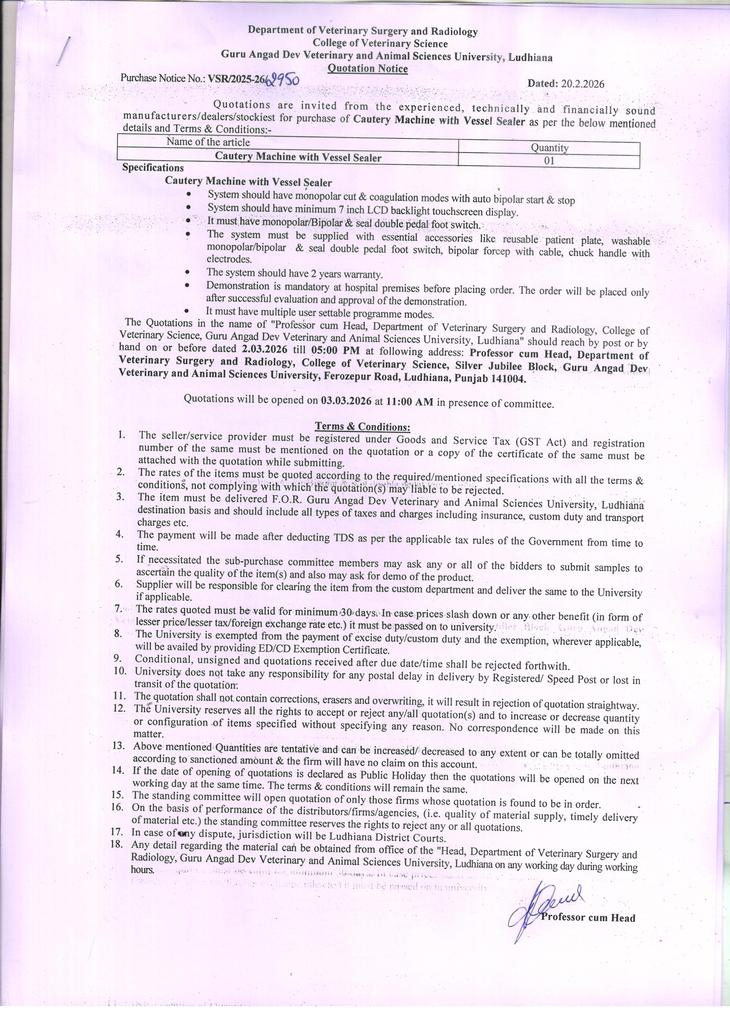 Quotation notice for the purchase of Cautery Machine with Vessel Scaler, Professor cum Head, Department of Veterinary Surgery & Radiology, Guru Angad Dev Vety. & Animal Sciences University, Ludhiana