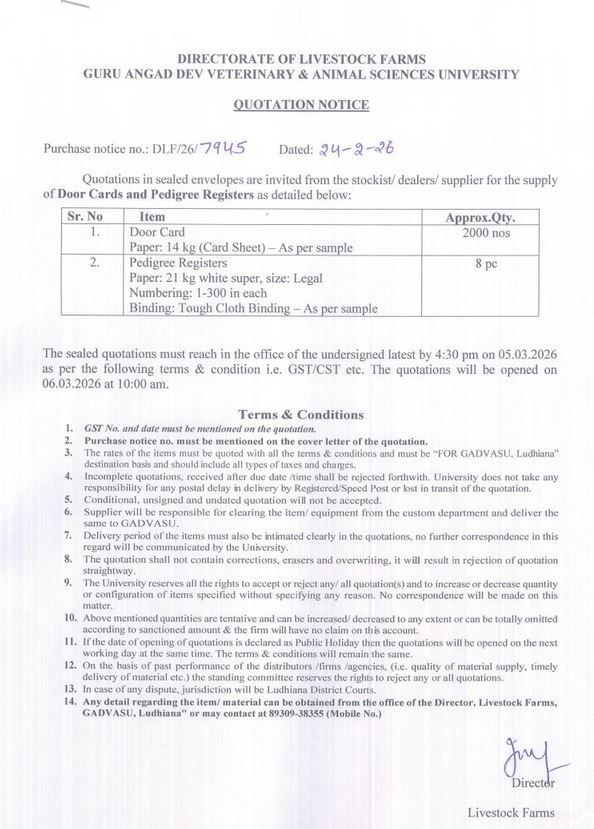 Quotation Notice for the supply of Door cards and Pedigree registers, Director, Livestock Farms, Guru Angad Dev Veterinary and Animal Sciences University, Ludhiana