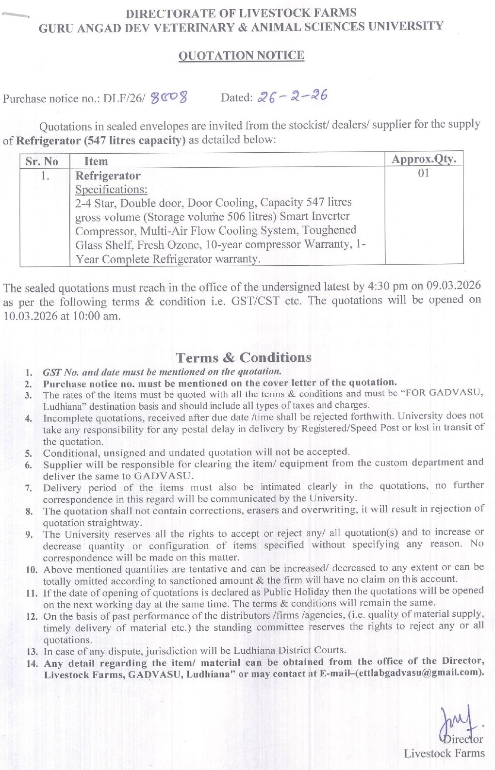 Quotation Notice for the supply of Refrigerator, Director, Livestock Farms, Guru Angad Dev Veterinary and Animal Sciences University, Ludhiana