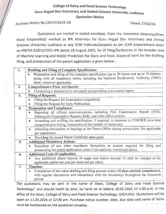 Quotation notice for patent/ip filing, Dean, College of Dairy & Food Science Technology, Guru Angad Dev Veterinary & Animal Sciences University, Ludhiana