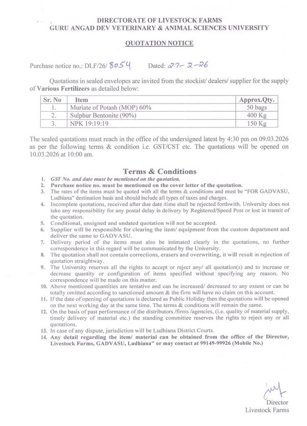 Quotation Notice for the supply of Various Fertilizers, Director, Livestock Farms, Guru Angad Dev Veterinary and Animal Sciences University, Ludhiana