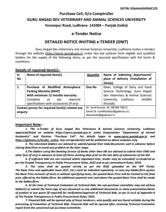 Click here to view Full details for e-tender for the Purchase of Modified Atmosphere Packing Machine (MAP)