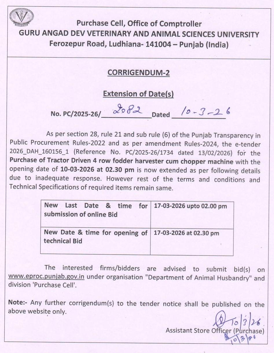 Click here to view the full details of e tender for the purchase of Tractor Driven 4 row fodder harvester cum chopper