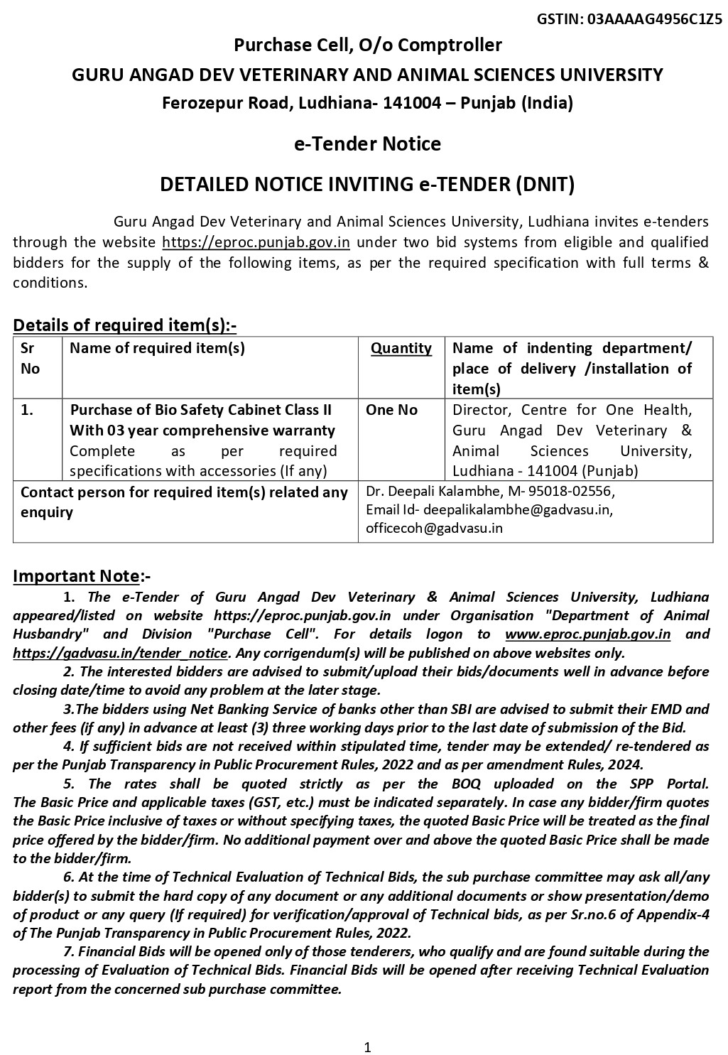 Click here to view the full details of e tender for the Purchase of Bio Safety Cabinet Class II