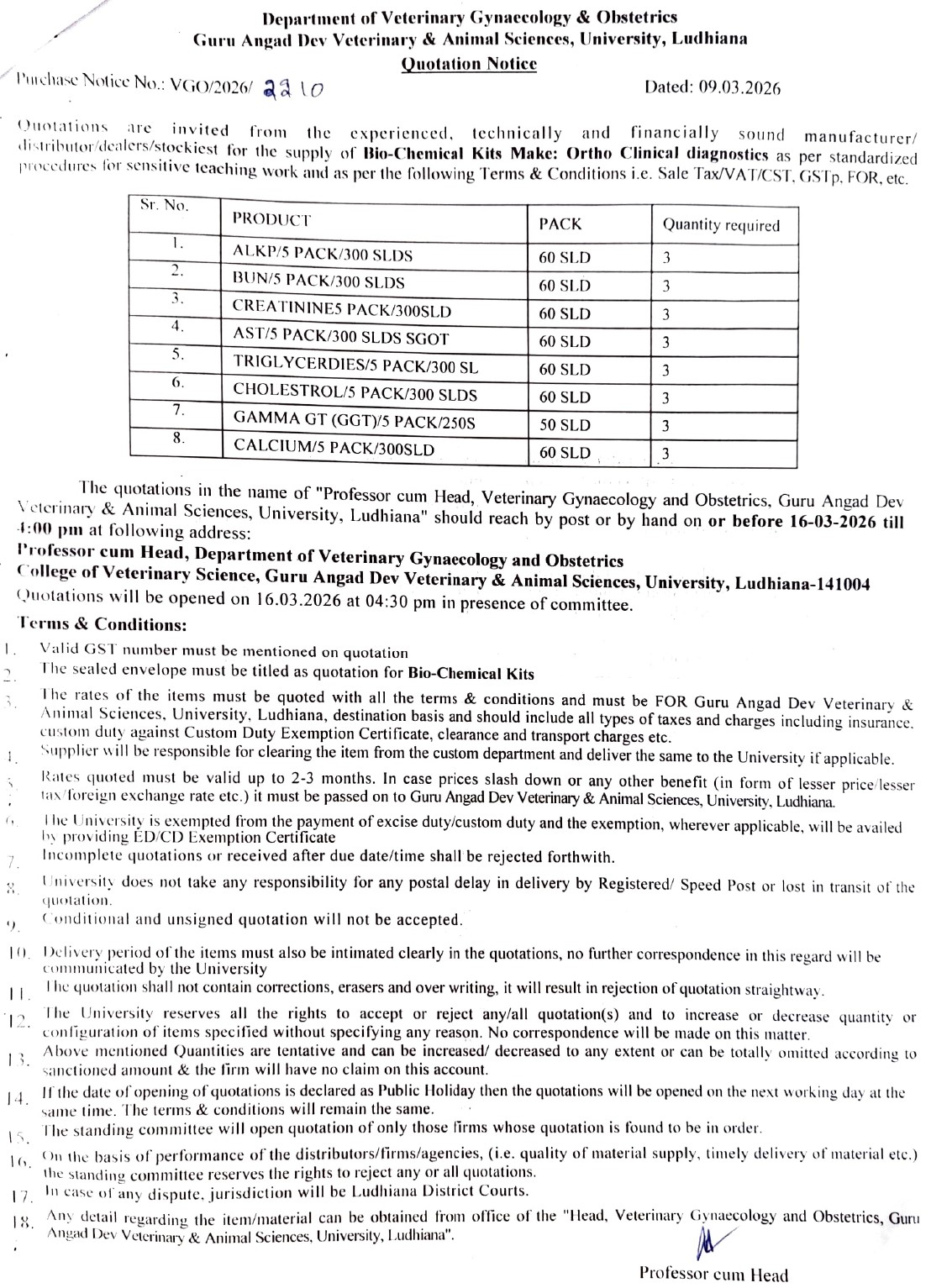 Quotation notice for the supply of Bio-Chemical Kits Make: Ortho Clinical diagnostics, Professor cum Head, Department of Veterinary Gynaecology & Obstetrics, GADVASU, Ldh.
