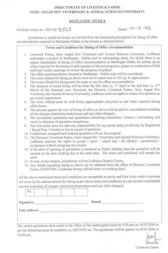 Quotation Notice for Hiring of Office accommodation required in Mullanpur-Dakha , Director, Livestock Farms, Guru Angad Dev Veterinary and Animal Sciences University, Ludhiana