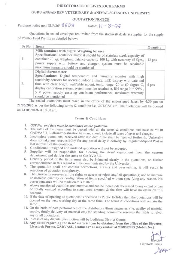 Quotation Notice for the supply of Poultry Feed Premix, Director, Livestock Farms, Guru Angad Dev Veterinary and Animal Sciences University, Ludhiana