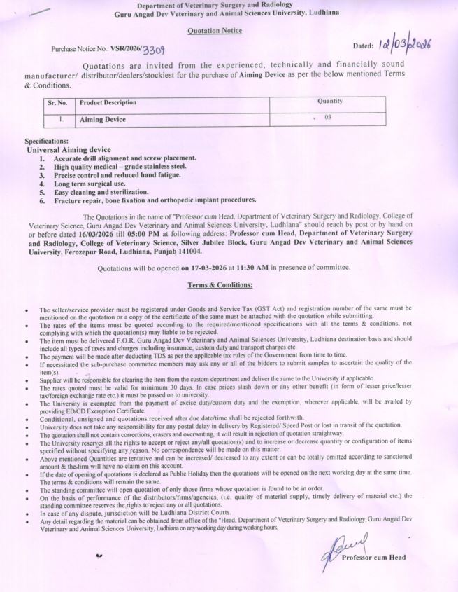 Quotation notice for the purchase of Aiming Device, Professor cum Head, Department of Veterinary Surgery & Radiology, Guru Angad Dev Vety. & Animal Sciences University, Ludhiana