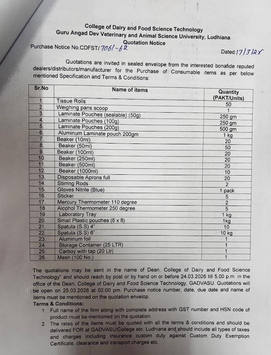 Quotation Notice for the purchase of Consumable Items, Dean, College of Dairy & Food Science Technology, Guru Angad Dev Veterinary & Animal Sciences University, Ludhiana