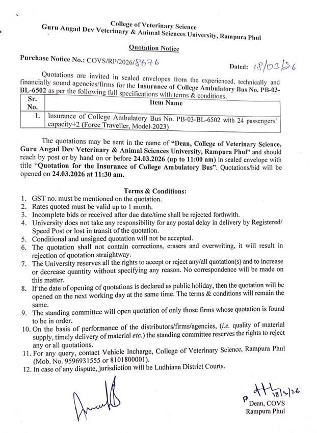 Quotations for the insurance of College Ambulatory Bus, Dean, College of Veterinary Science, Guru Angad Dev Veterinary & Animal Sciences University, Rampura Phul