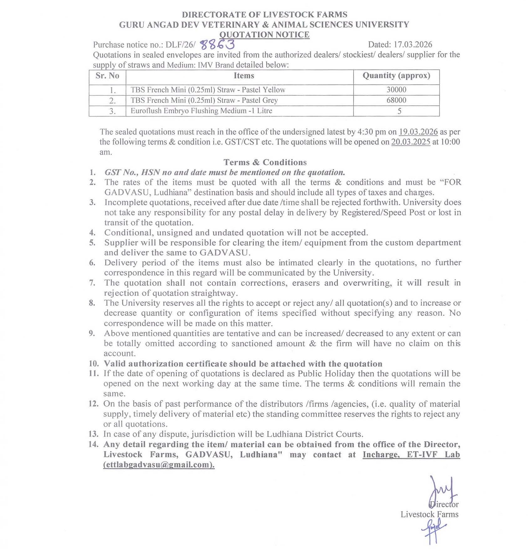 Quotation notice for the supply of Straws and Medium, Director, Livestock Farms, Guru Angad Dev Veterinary and Animal Sciences University, Ludhiana