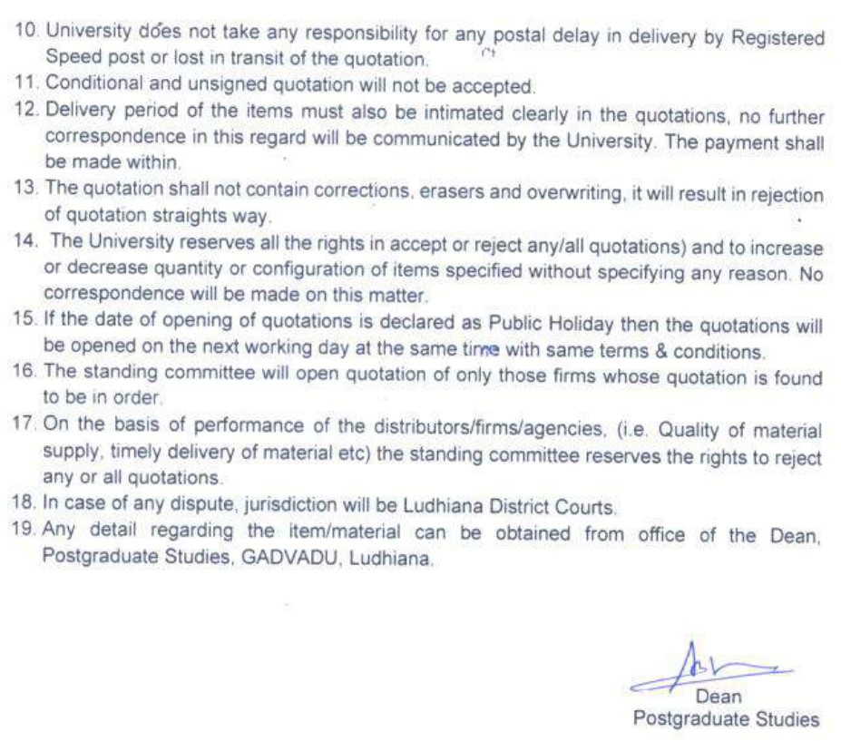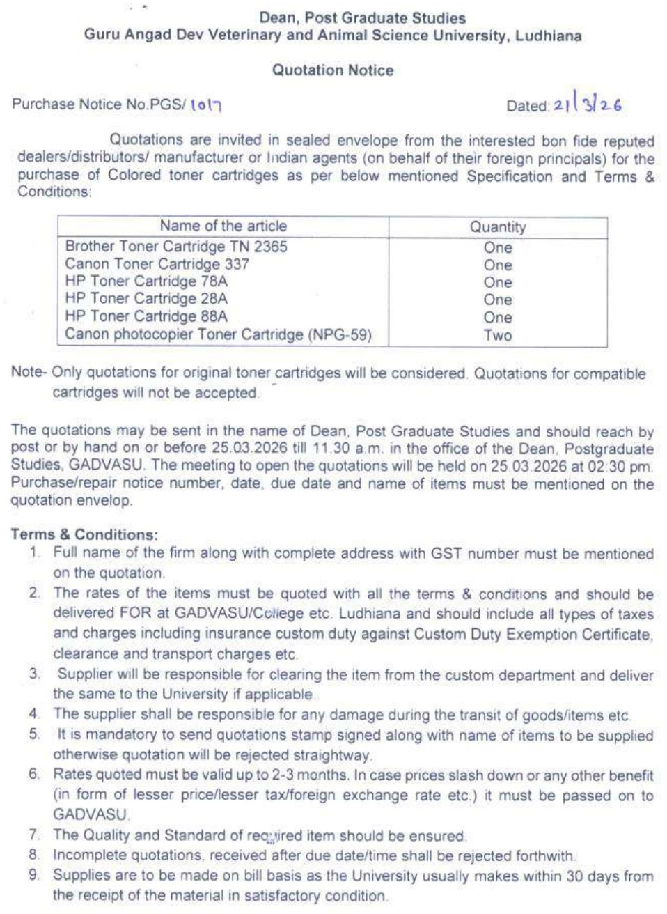 Quotation Notice for purchase of Colored Toner Cartridges, Dean, Postgraduate Studies, Guru Angad Dev Veterinary & Animal Sciences University, Ludhiana