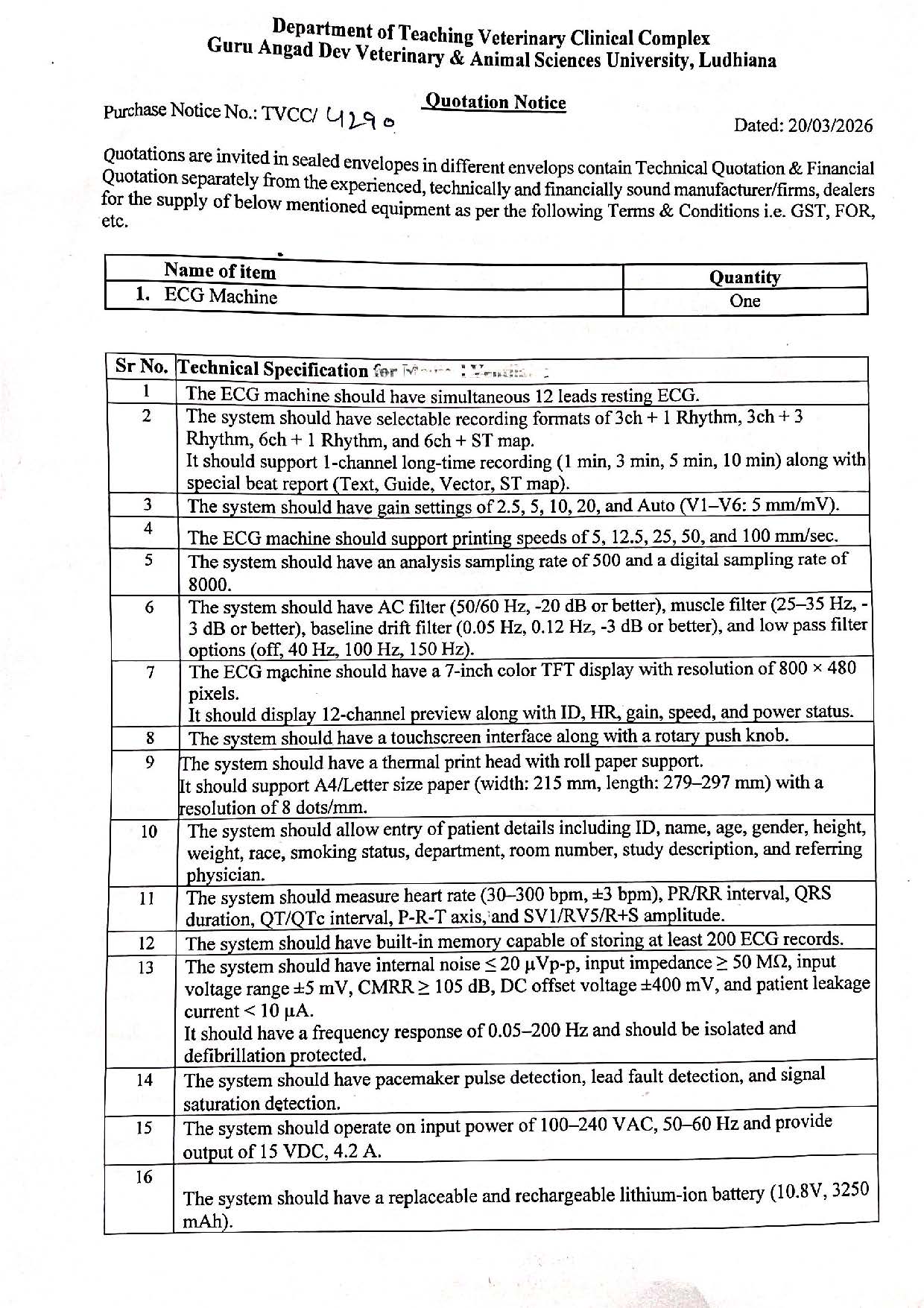 Quotation notice for the purchase of ECG Machine, Director of Clinics, Deptt. of Teaching Veterinary Clinical Complex, GADVASU, Ludhiana