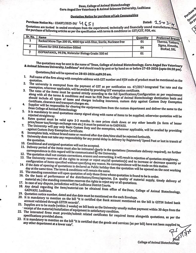 Quotation notice for the purchase of Lab Consumables, Dean, College of Animal Biotechnology, Guru Angad Dev Veterinary & Animal Sciences University, Ludhiana