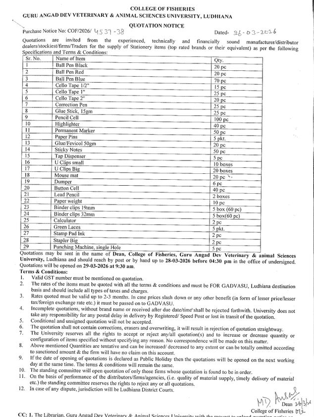 Quotation notice for the supply of Stationery Items, Dean, College of Fisheries, Guru Angad Dev Veterinary & Animal Sciences University, Ludhiana