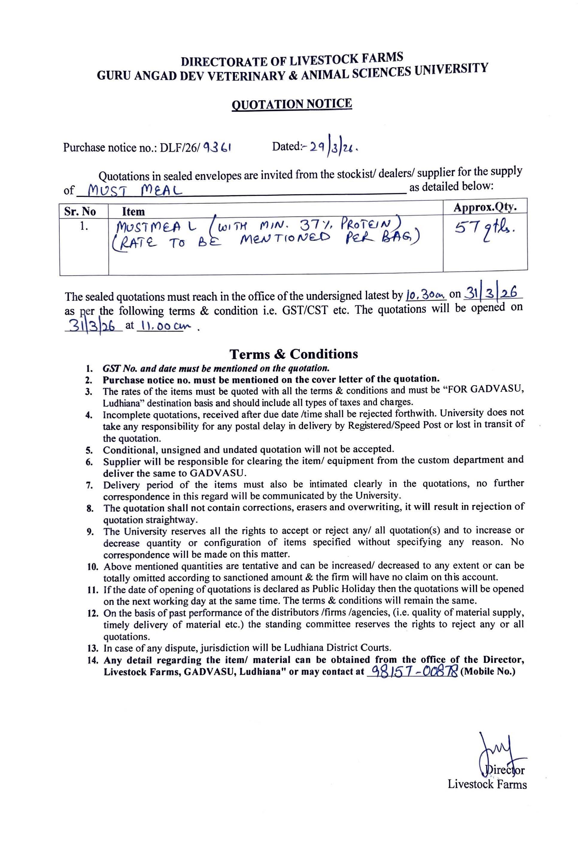 Quotation notice for the supply of Must Meal, Director, Livestock Farms, Guru Angad Dev Veterinary and Animal Sciences University Ludhiana