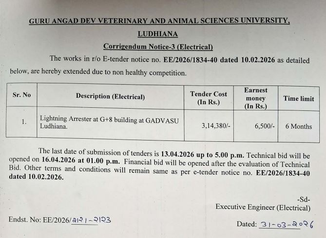 Corrigendum-3 (Date Extension) in respect of E-Tender Notice no.1834-40 dated 10.02.2026 (Electrical Work), Executive Engineer (Electrical), GADVASU, ludhiana