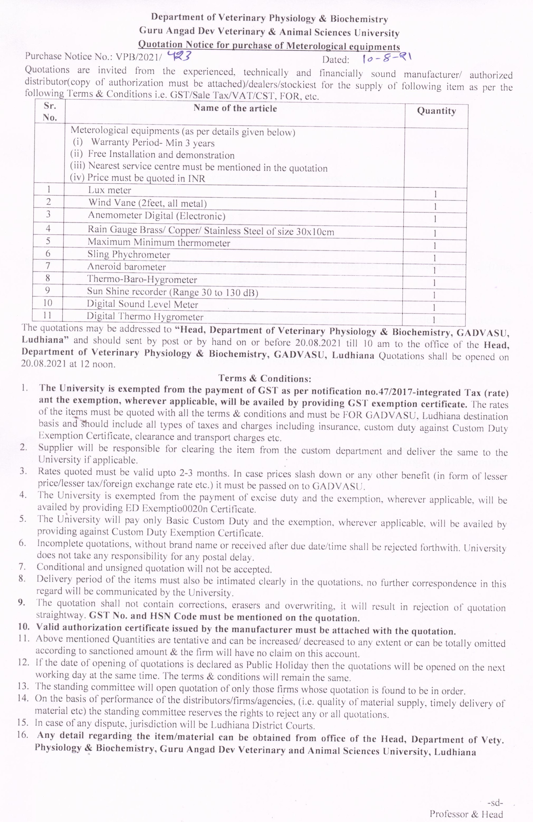 Quotation notice for the purchase of Meterological equipments, Professor-cum-Head, Dept. of Veterinary Physiology & Biochemistry, COVS, GADVASU, Ludhiana