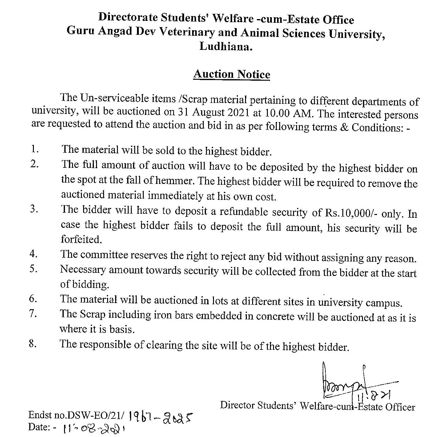 Auction notice for unserviceable items/Scrap material, DSW-cum-EO, GADVASU, Ludhiana