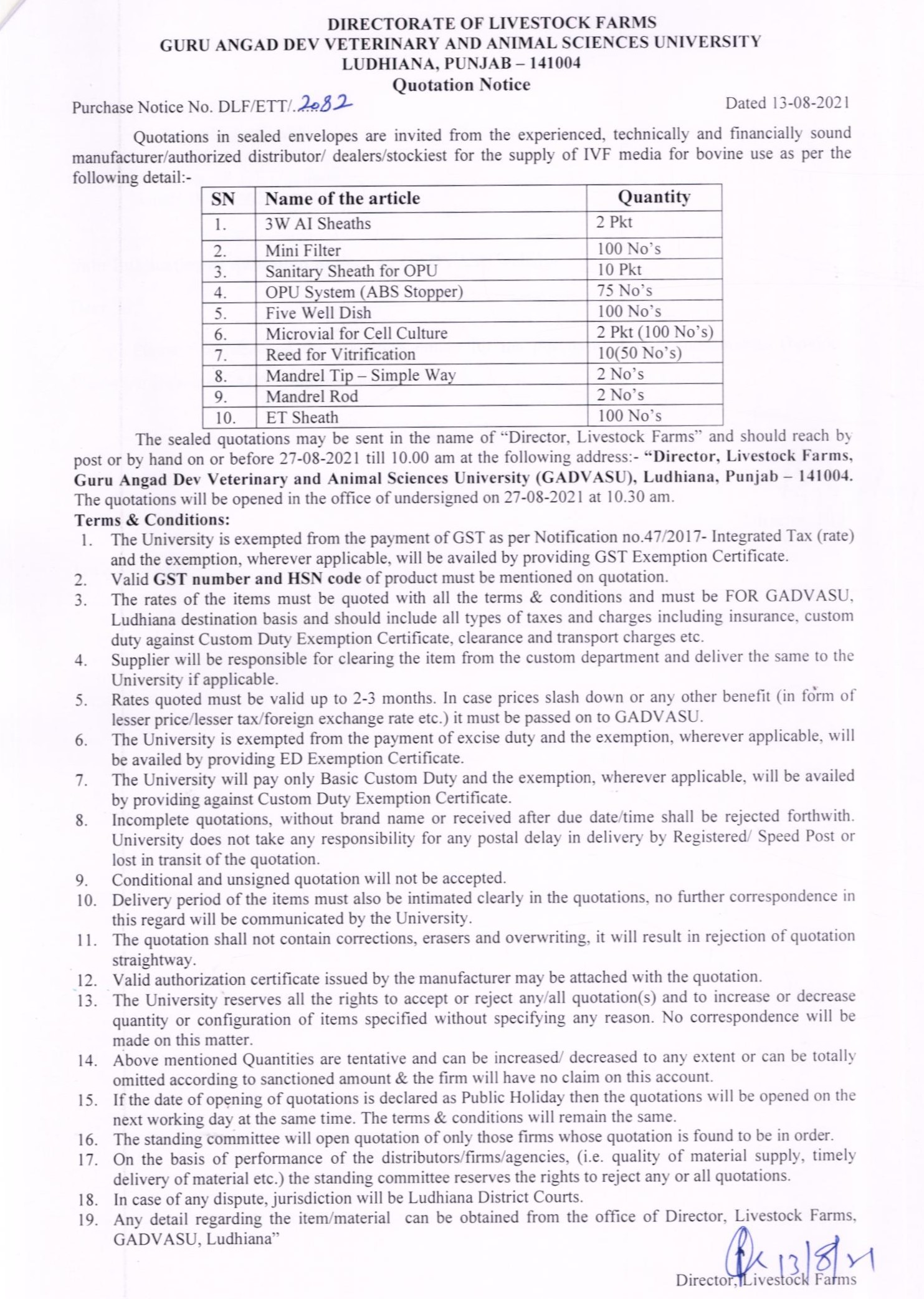 Quotation notice for the supply of IVF media for bovine, Directorate of Livestock Farms, GADVASU, Ludhiana