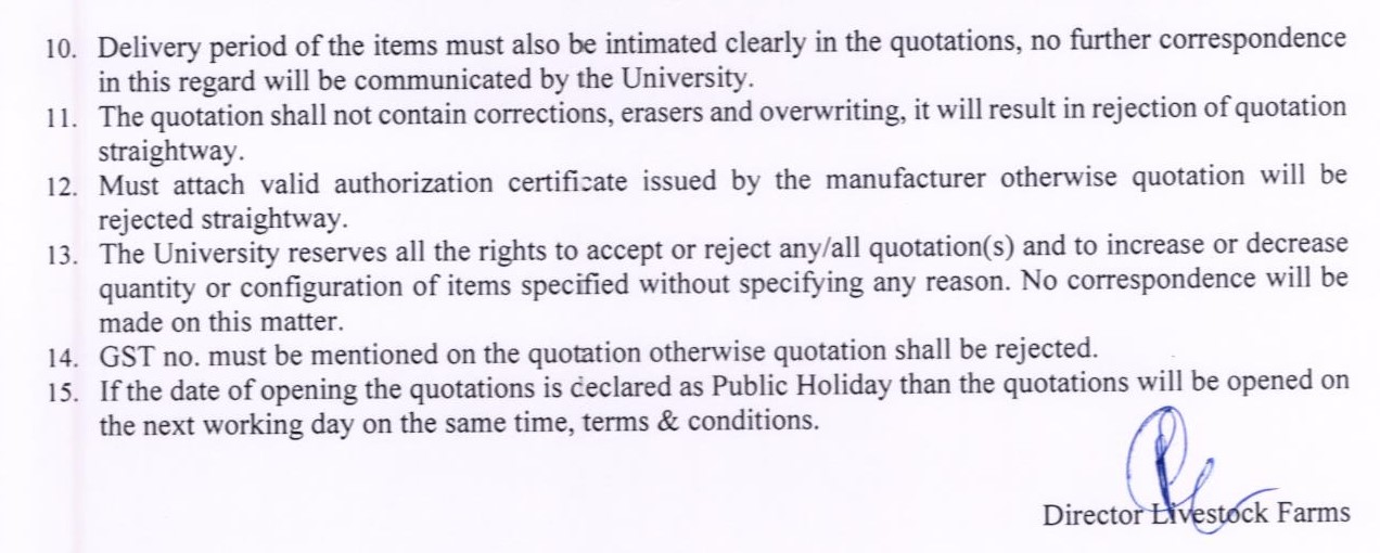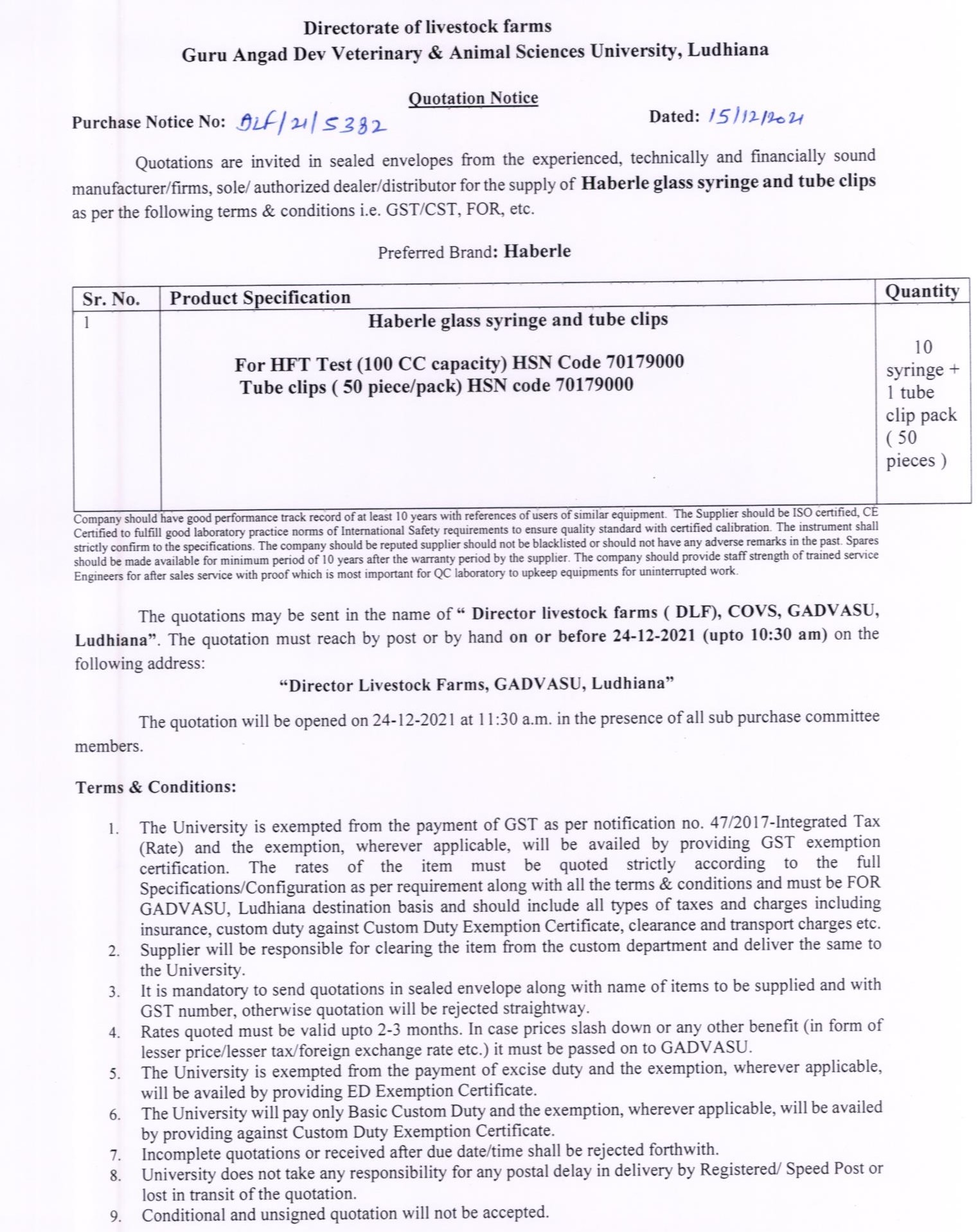 Quotation notice for the Purchase of Herberle glass syringe and tube clips, Directorate of Livestock Farms, GADVASU, Ludhiana