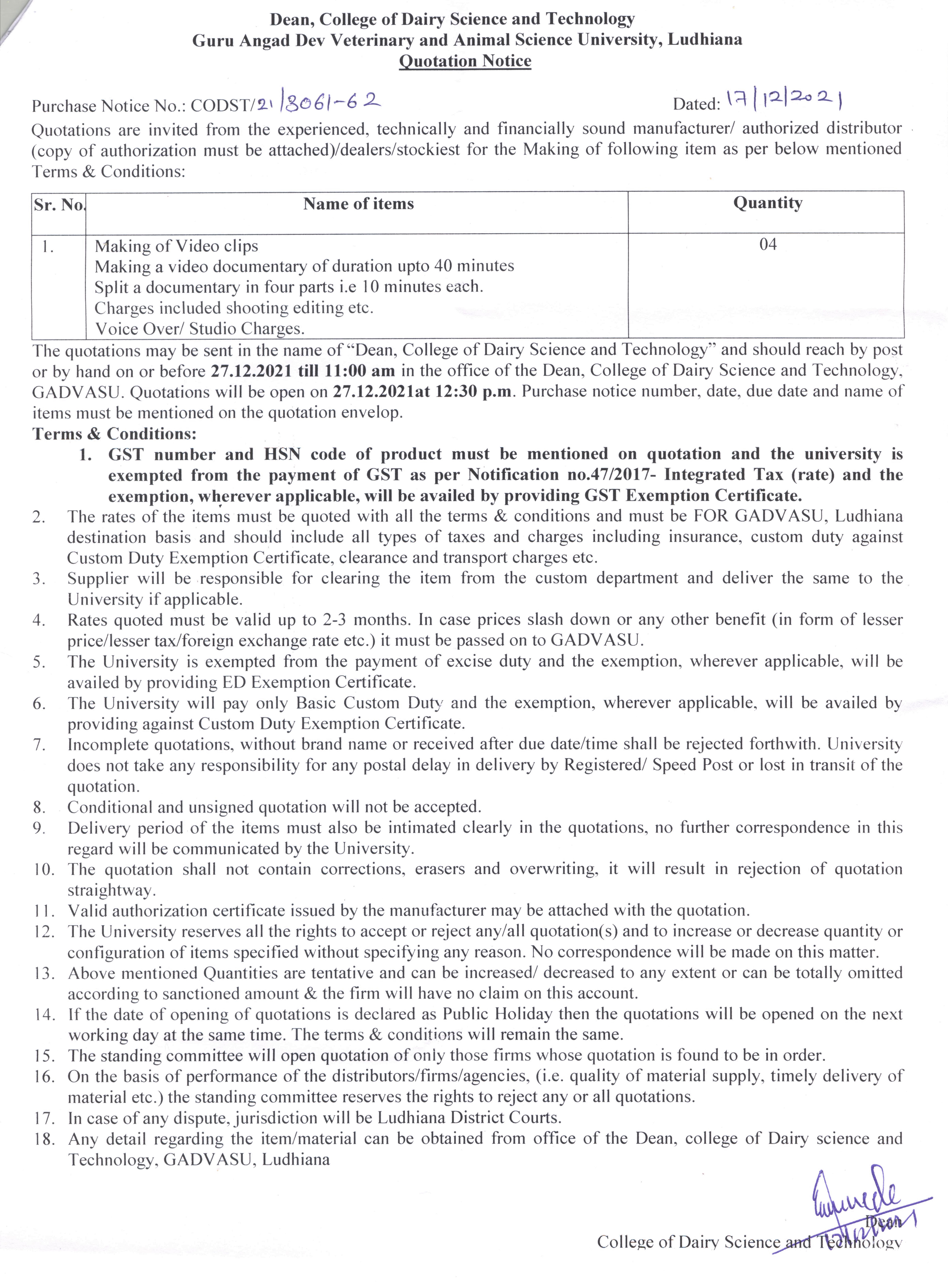 Quotation notice for the making of Video Clips, Dean, College of Dairy Science and Technology, GADVASU, Ludhiana