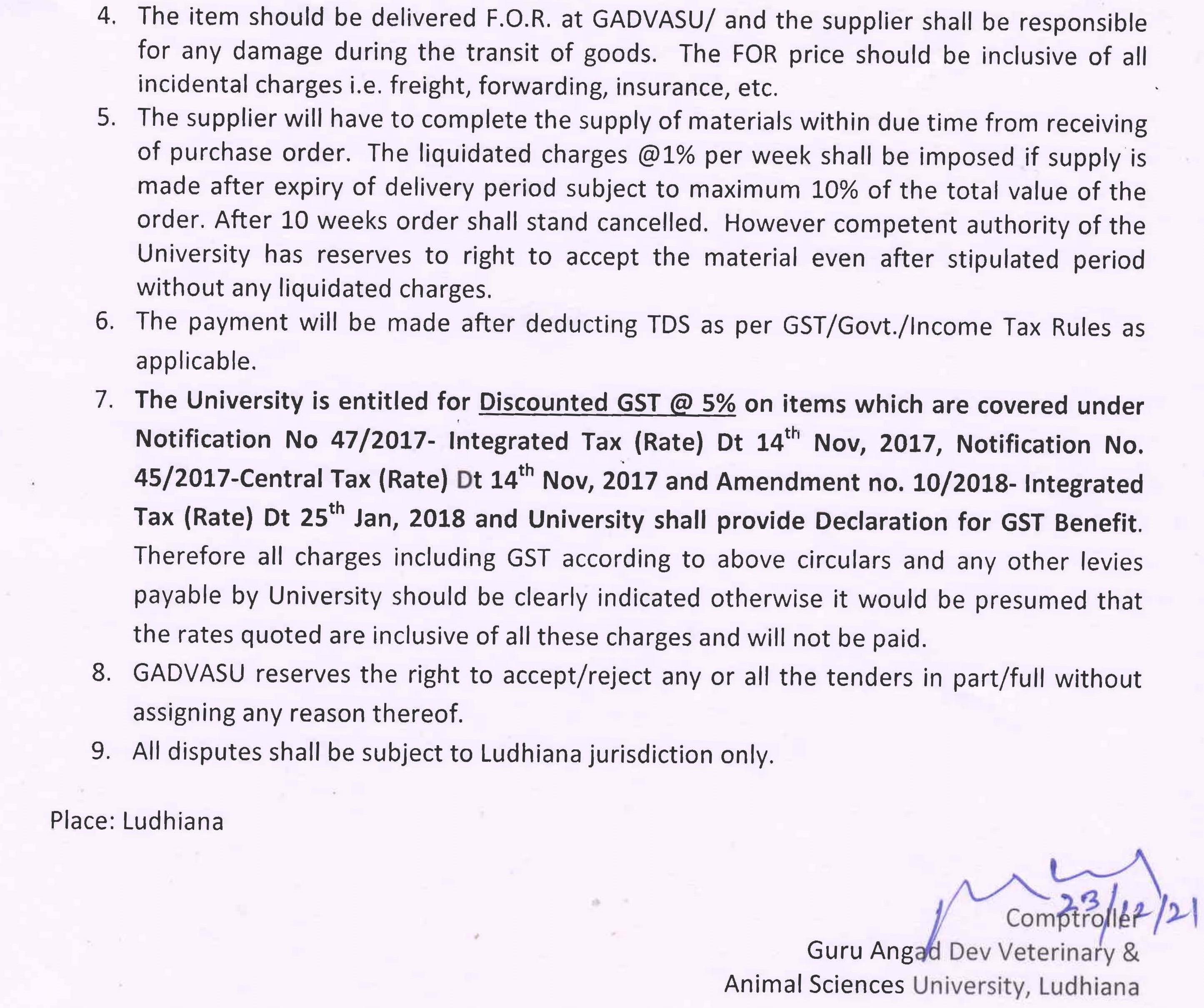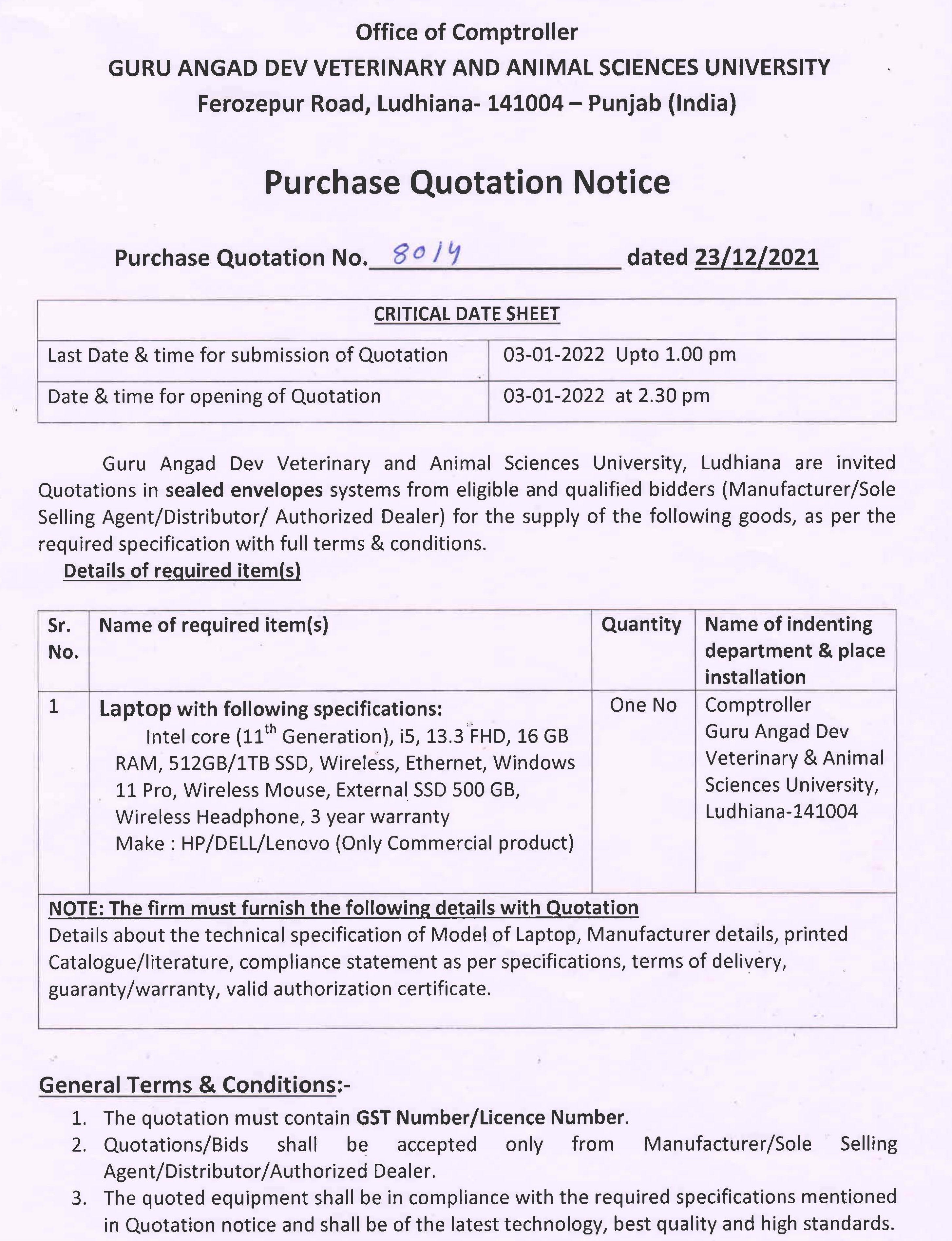 Quotation notice for the purchase of Laptop, O/o Comptroller, GADVASU, Ludhiana