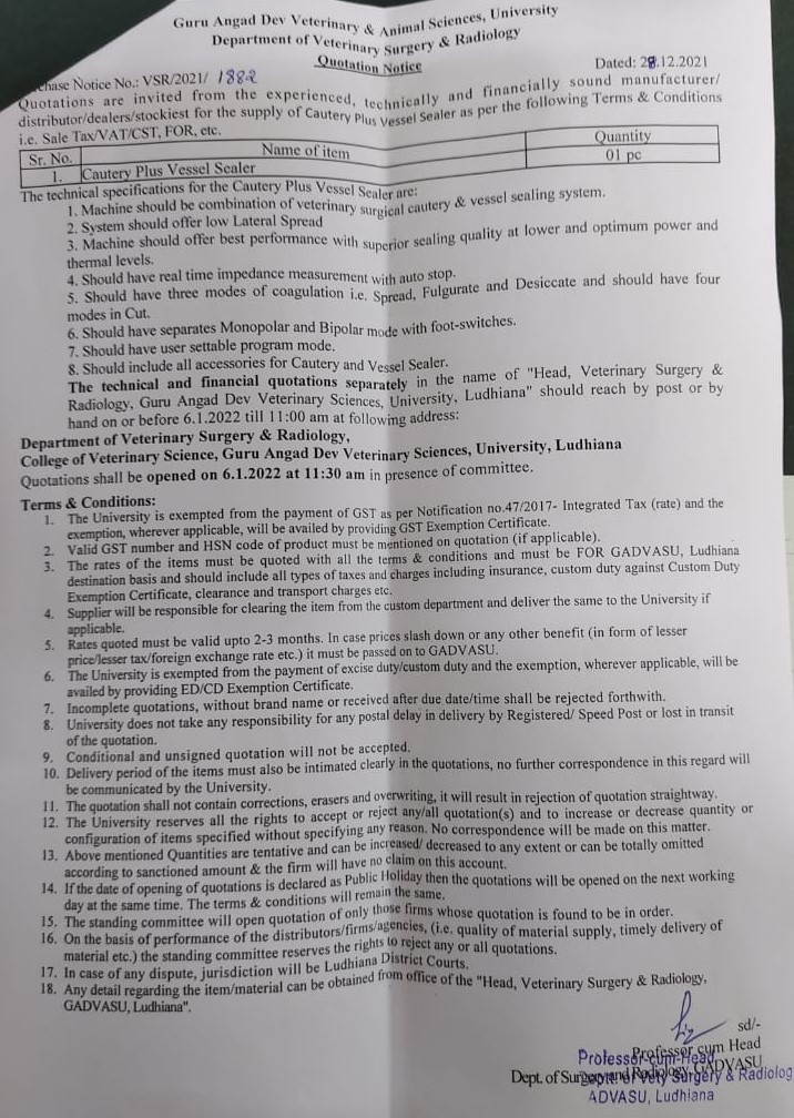 Quotation notice for the supply of Cautery plus vessel sealer, Professor-cum-Head, Dept. of Veterinary Surgery & Radiology, GADVASU, Ludhiana