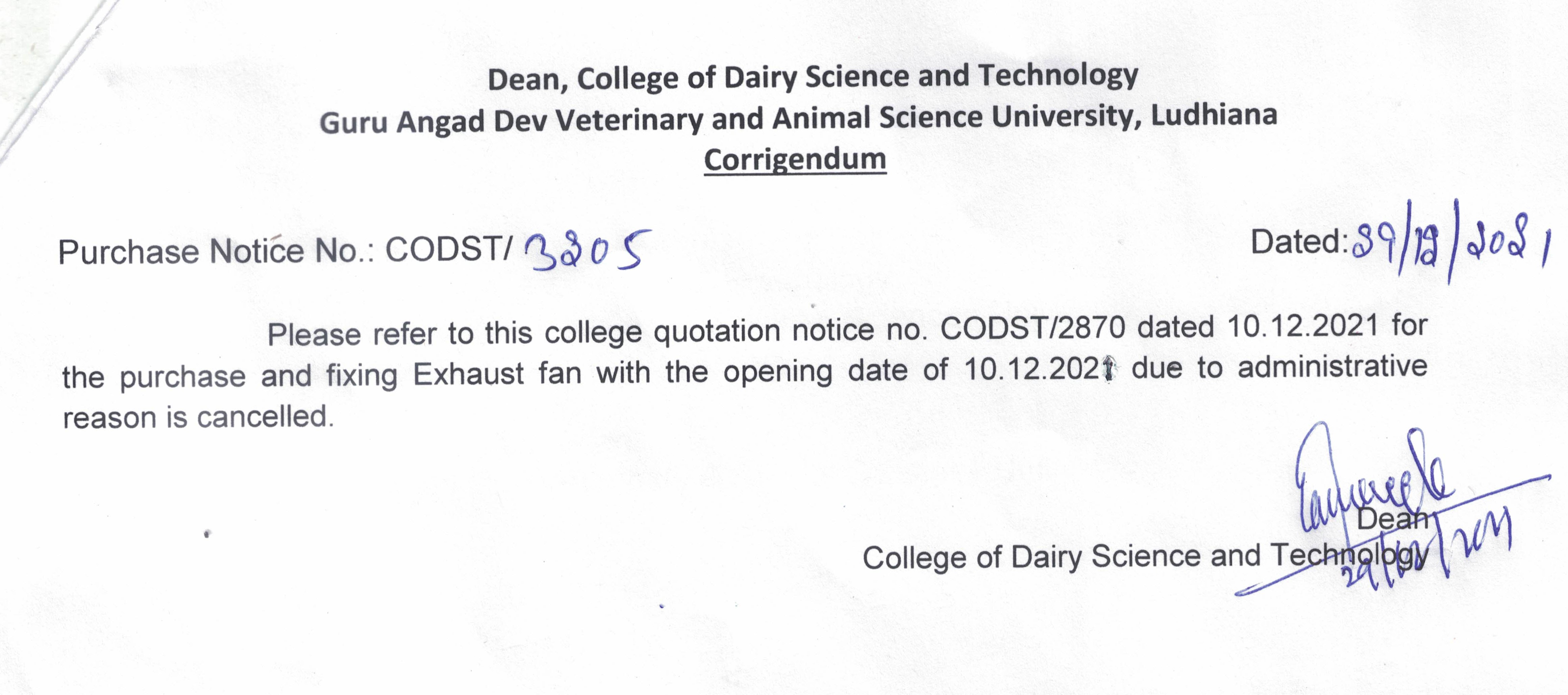 Cancellation of quotation for the purchase and fixing of Exhaust Fan , Dean, College of Dairy Science and Technology, GADVASU, Ludhiana