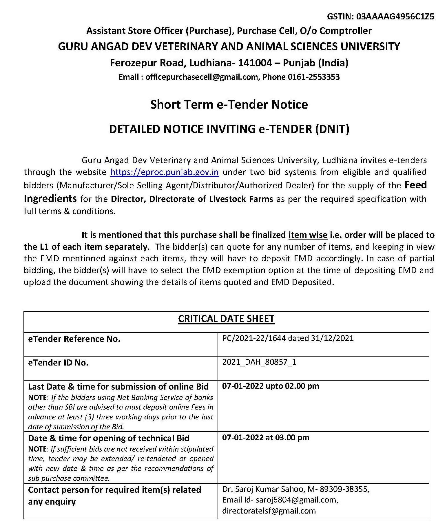 Short term e-Tender Notice for the Purchase of Feed Ingredients, O/o Purchase Cell, Comptroller, GADVASU, Ludhiana