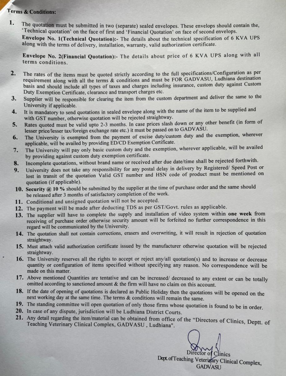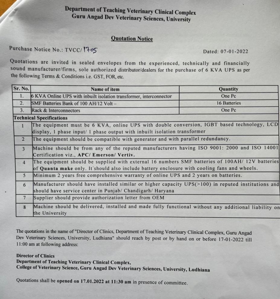 Quotation notice for the purchase of 6 KVA UPS , Director of Clinics, Dept. of Teaching Veterinary Clinical Complex, GADVASU, Ludhiana