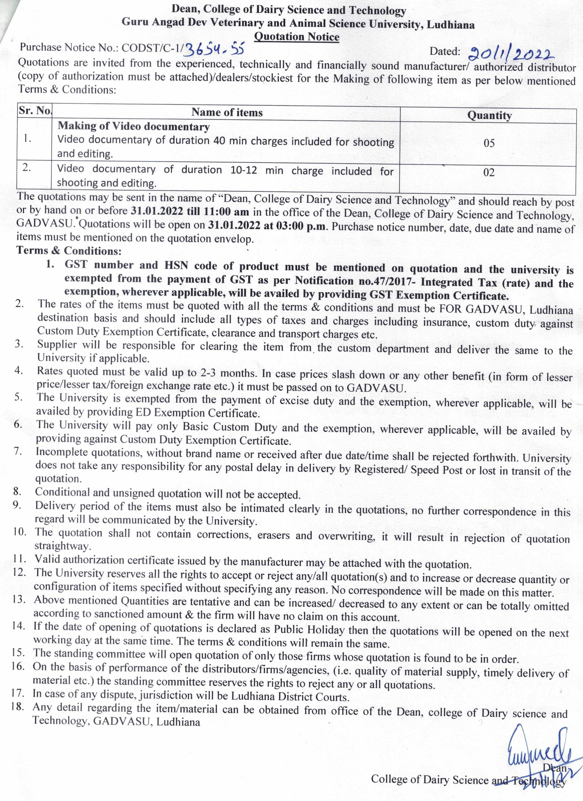 Quotation notice for making of video documentary, Dean, College of Dairy Science and Technology, GADVASU, Ludhiana