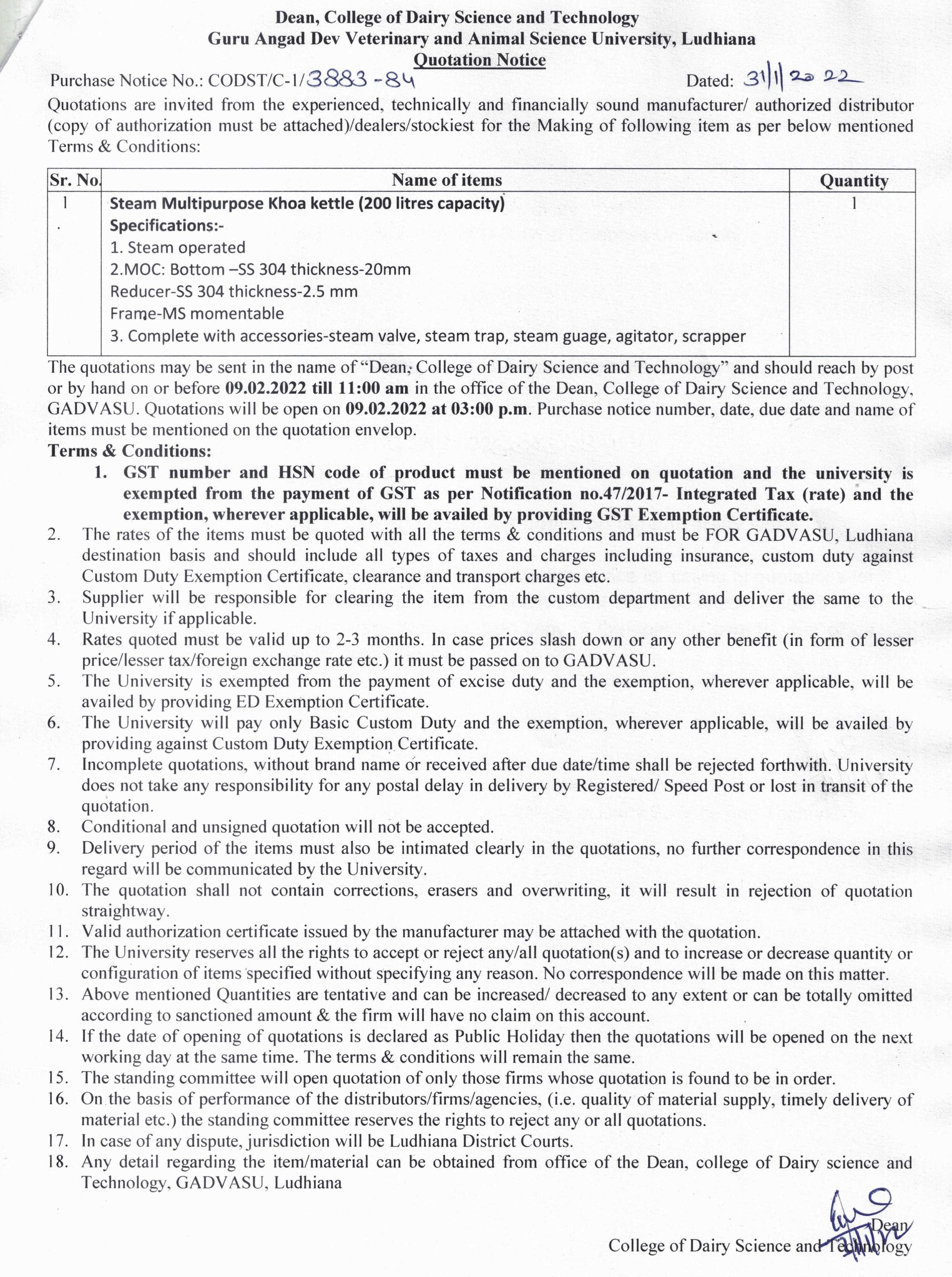 Quotation notice for the Purchase of Steam Multipurpose Khoa kettle, Dean, College of Dairy Science and Technology, GADVASU, Ludhiana