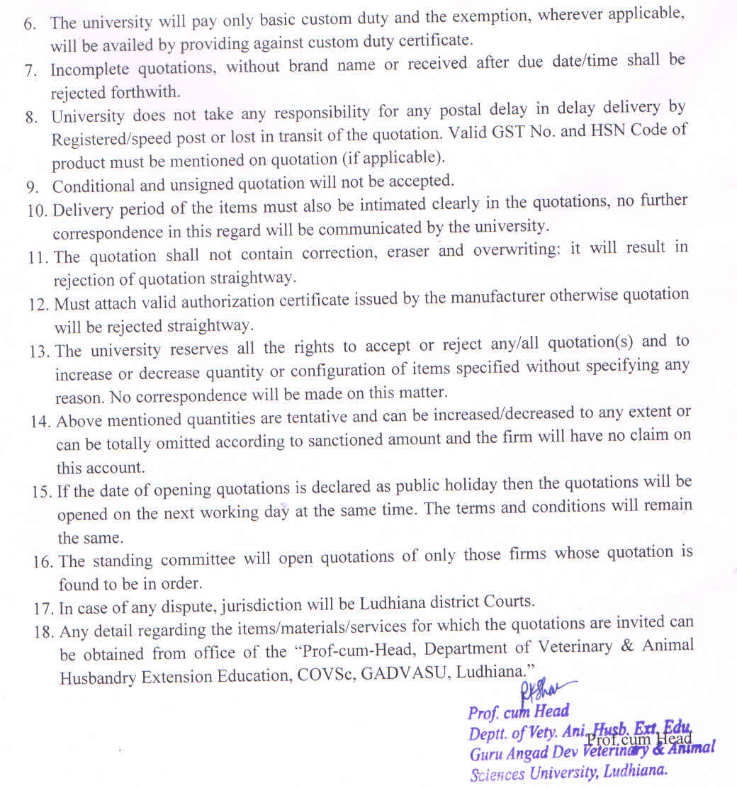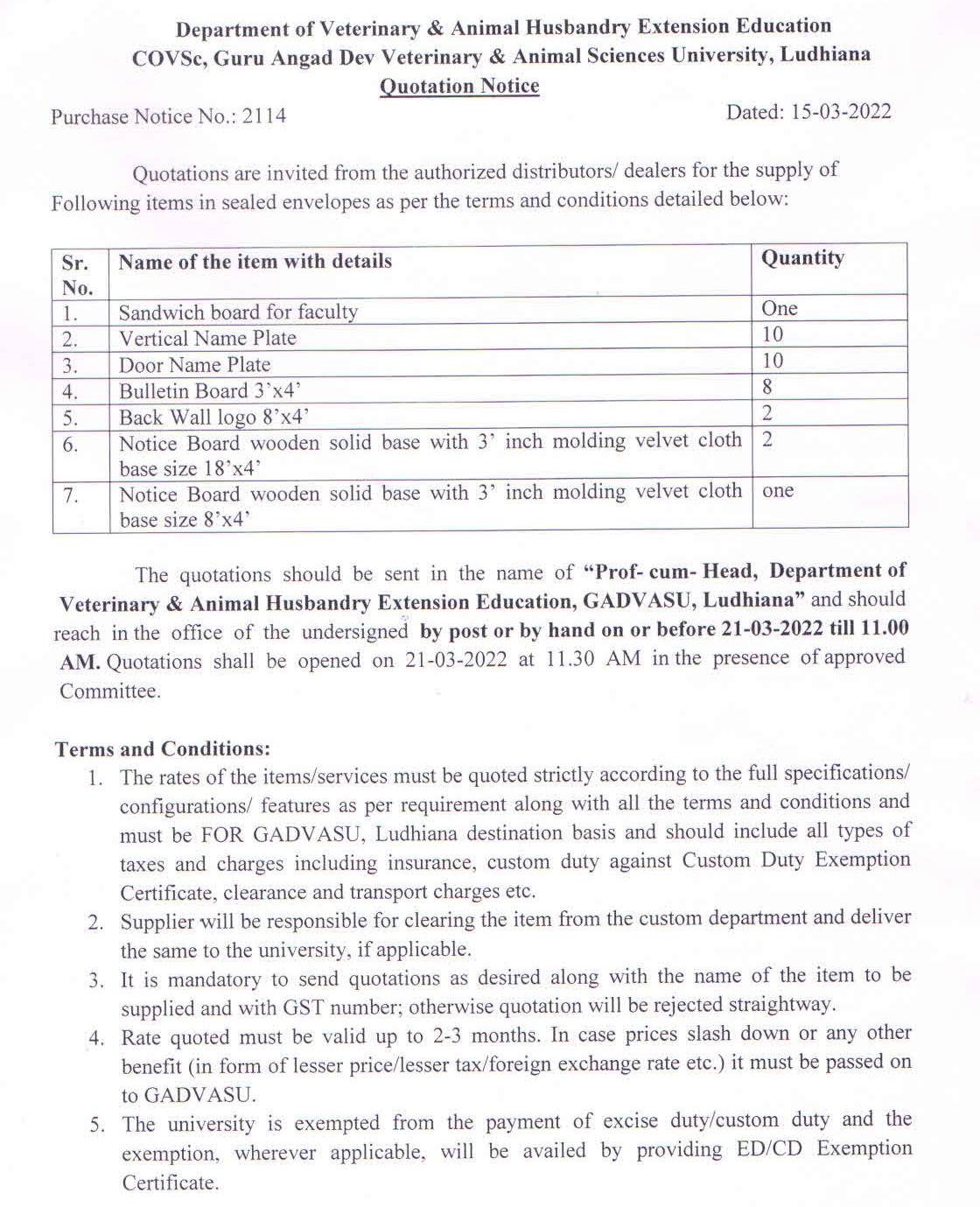 Quotation notice for the supply of various materials, Department of Veterinary & Animal Husbandry Extension Education, COVS, GADVASU, Ludhiana