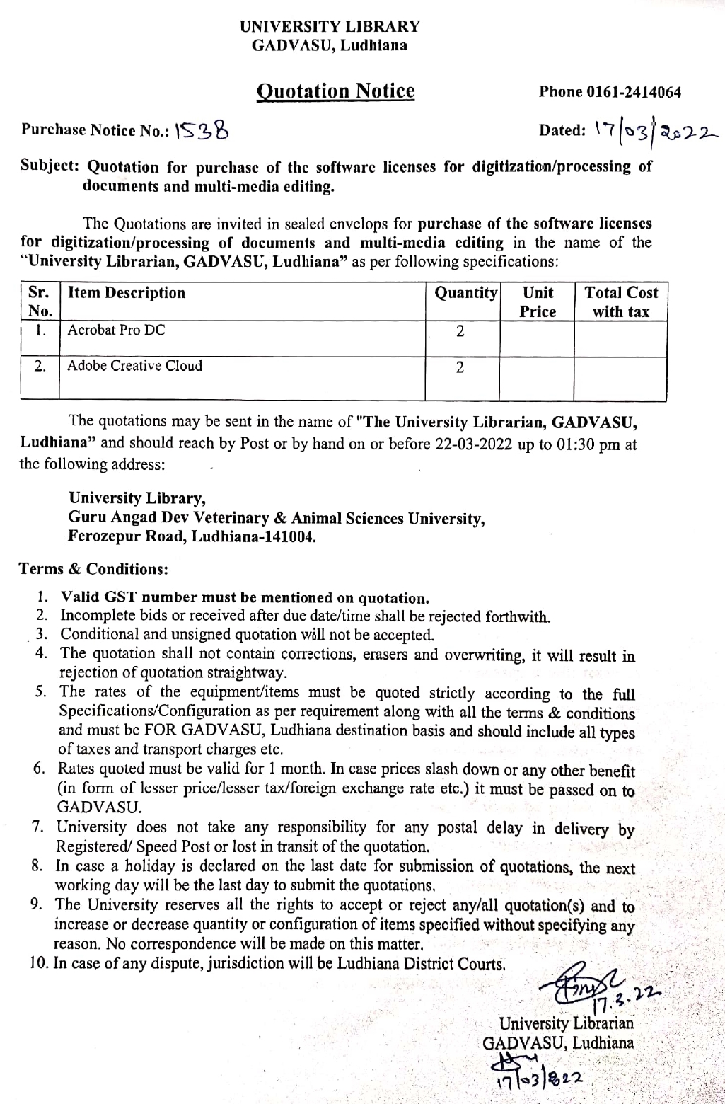 Quotation notice for the purchase of the software licenses for digitization/processing of documents and multi-media editing, University Librarian, GADVASU, Ludhiana